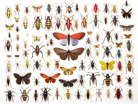 Explore the intricate world of insects with a captivating set of nine diverse specimens, meticulously displayed against a pristine white background.