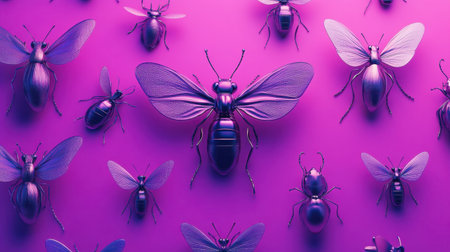 This striking image features a collection of colorful insects against a vibrant purple background, creating a visually captivating design for art and nature themes.