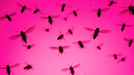This striking image showcases a swarm of insects in flight against a vibrant pink backdrop, highlighting their delicate wings and dynamic movements. Perfect for nature enthusiasts and artists.