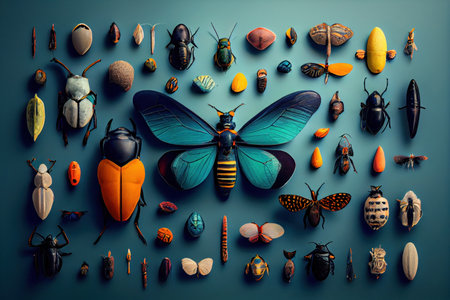 This striking image showcases a diverse array of vibrant insects displayed against a vividly colored backdrop, highlighting their intricate patterns and textures.