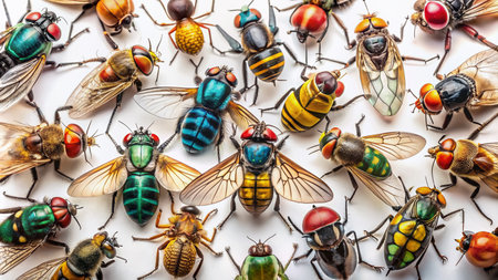 Macro view of assorted flies, including houseflies, blowflies, and fruit flies, scattered on a pristine white background, showcasing their distinct body shapes and colors.