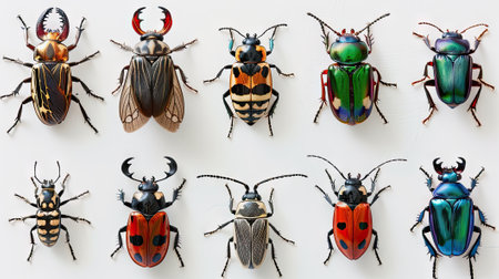 A vibrant arrangement of various beetle species showcasing unique colors and patterns. Ideal for educational and creative projects related to nature and biodiversity.