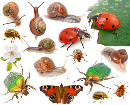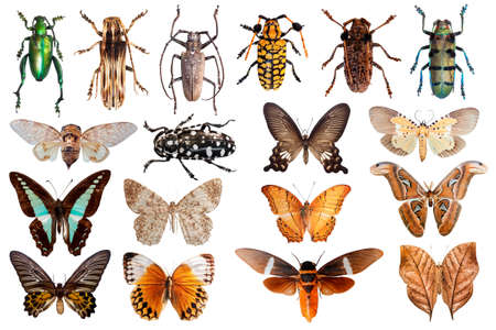 Butterflies, dragonfly, a grasshopper, other insects isolated a white background