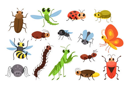 Colorful different insects, worms and bugs flat set for web design. Cartoon field beetles, maggot, earthworm and dragonfly isolated vector illustration collection. Pests and agriculture concept