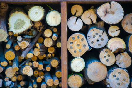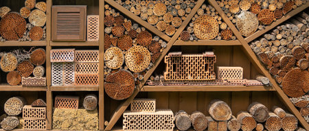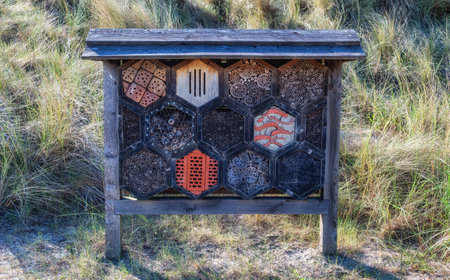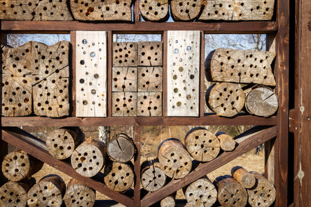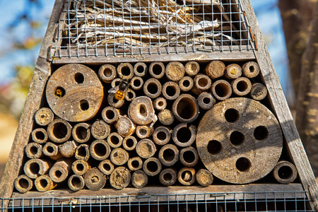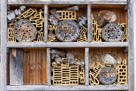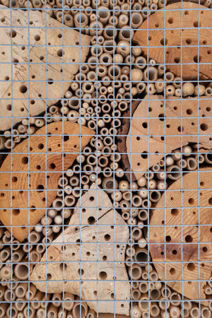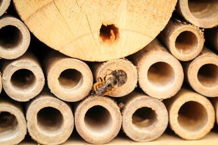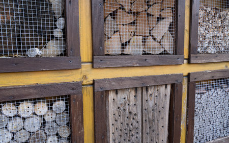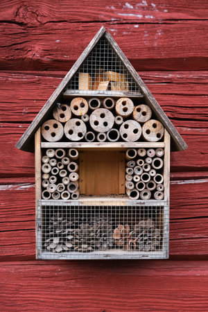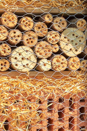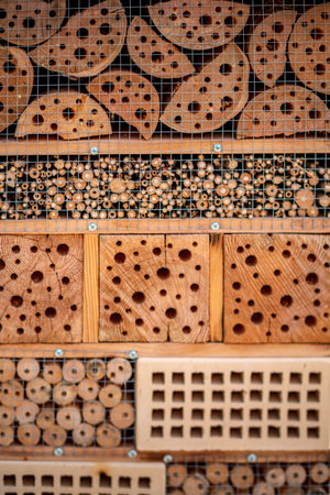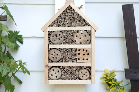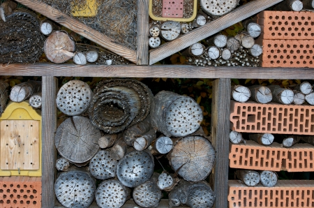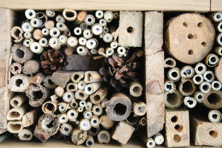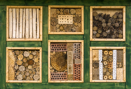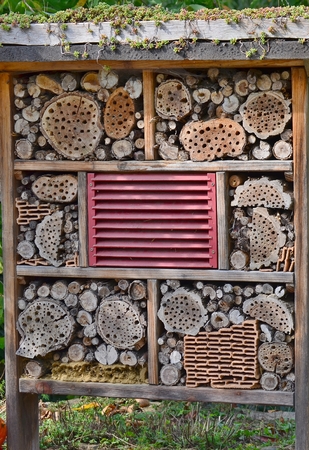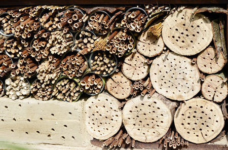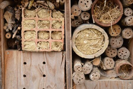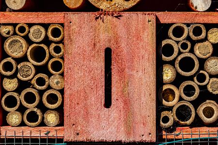 Close up of insect hotel: wooden nest box for wild insects. An insect hotel is a man made structure created to provide shelter for insects in a variety of shapes and sizes and materials.