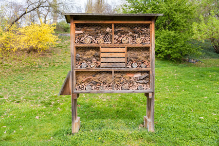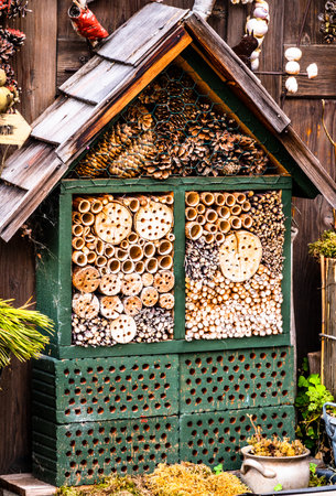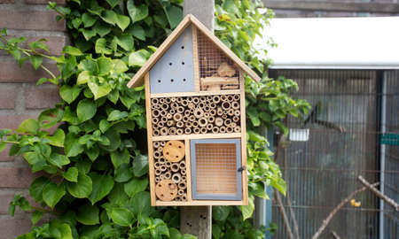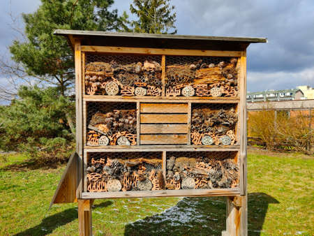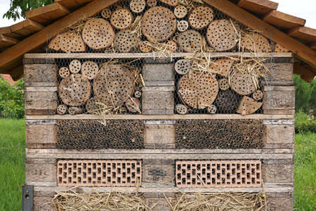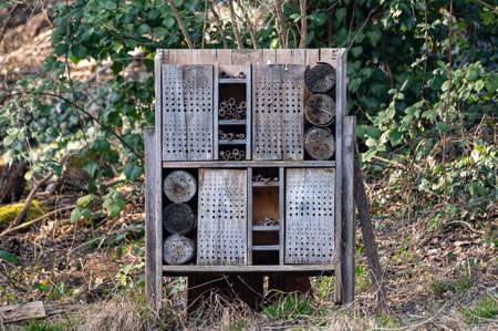 Insect hotel, an artificial structure created to provide shelter to insects. Object helps small insects survive mainly in urban conditions