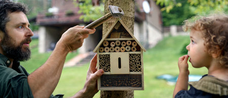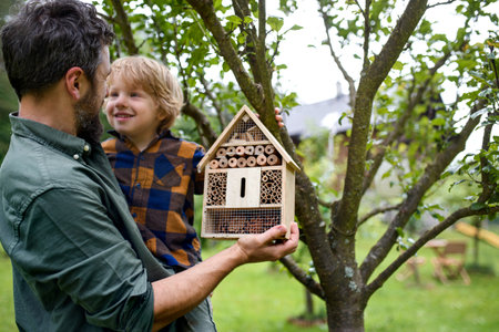Small boy with father holding bug and insect hotel in garden, sustainable lifestyle.