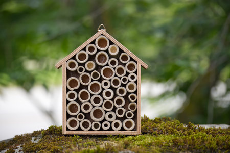 Special house for useful garden insects, built of natural materials. Creates natural conditions for maintaining the population of natural enemies of garden pests. Close up