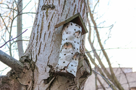 wooden bird feeder on a large tree in early spring