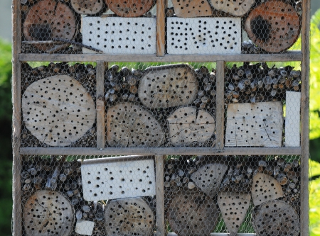 Insect hotel with many holes and different types of wood