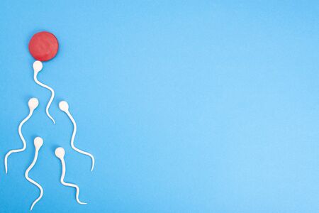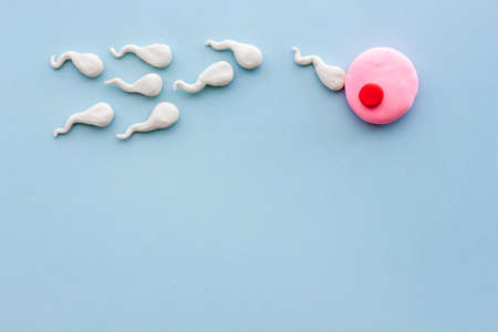 Active sperm swim in an egg on a blue background. The concept of pregnancy, fertilization of the egg. Top view with place for text