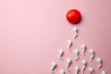 Active sperm cells swim to the egg on a pink background. The concept of pregnancy, fertilization of the egg. Copy space for text
