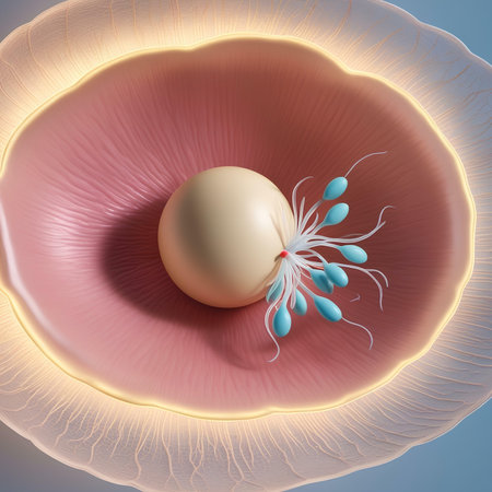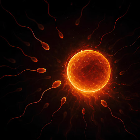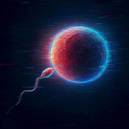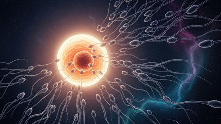 This image depicts a conceptual visualization of the fertilization process. The central focus is a glowing egg cell, surrounded by numerous sperm cells. The style is digital, using a dark background with light effects to create depth. It can be used in educational materials, scientific publications, and marketing visuals.