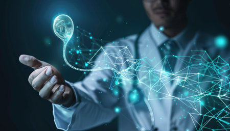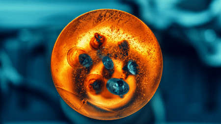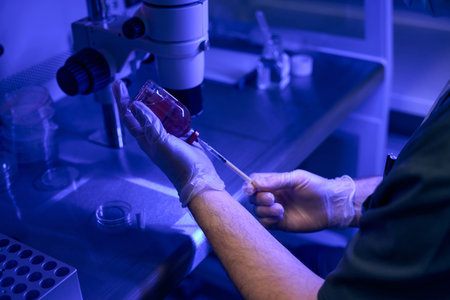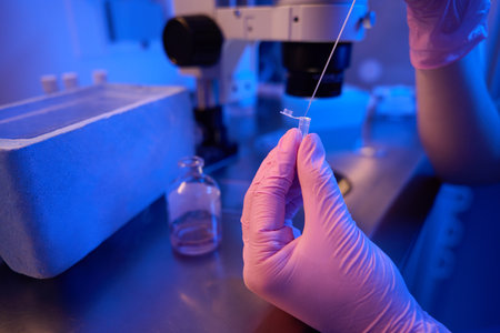 Gloved hands hold a translucent cell culture sample with visible cellular structures and bubbles under focused clinical light, indicating laboratory research and microscopy, with available space for text on a neutral background
