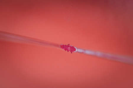 Medical test tube lying in a one use capsule on the hospital's green background. The background can be a textile part of a doctor or nurse's work uniform