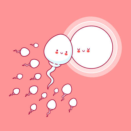 Cute happy funny sperm cell and ovum. Vector flat line cartoon kawaii character illustration icon. Fertilization concept
