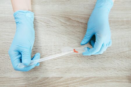 Cropped view of doctor in latex gloves holding pipette and misroscope slide with blood sample