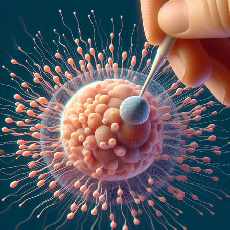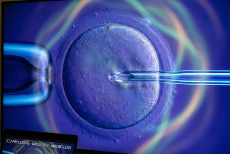 Micropipette injecting sperm into a human egg cell during an icsi procedure under a microscope, symbolizing artificial insemination, precision embryology, and assisted reproductive technology