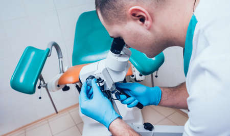 Young professional gynecologist exam patient with colposcope, healthcare concept