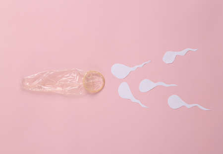 Contraceptive. Condom with sperm cells on a pink background. Minimal still life