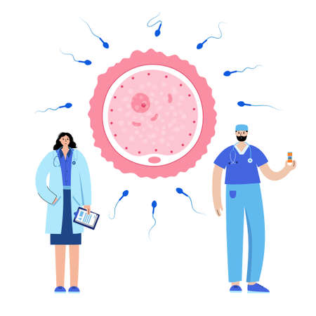 Fertilization of an egg. Sperm cells and a female egg, vector illustration