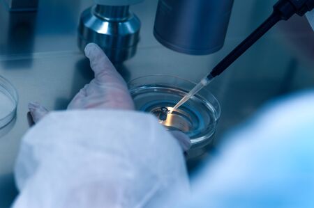 Hand of an unidentified laboratory assistant in protective clothing squeezes the tests using a special pipette onto the microscope glass. The concept of a modern high-tech medical laboratory