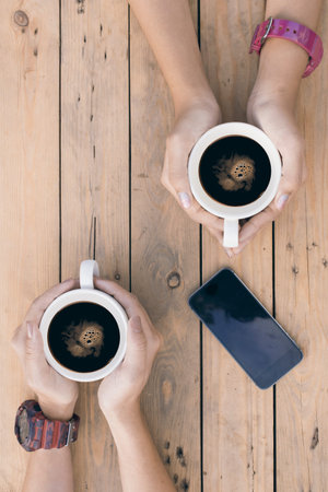 Female hands holding cups of coffee with smart phone on wooden table