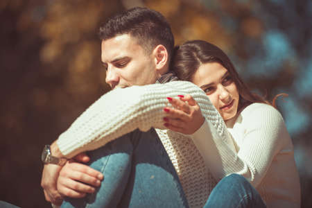 Teenagers in love sit on park bench, resting in the rays of autumn sun, boy looking straight ahead. Concept of teen love