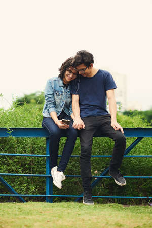 Our love for the same music brought us together. a teenage couple listening to music together outdoors.