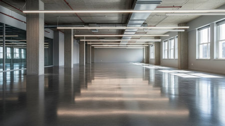 An empty, expansive modern office interior with a highly polished concrete floor reflecting linear lights and...