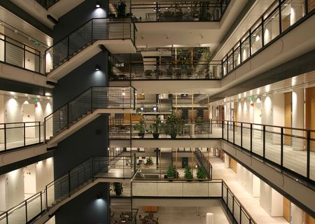 Interior of a modern office building with glass walls and arches
