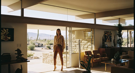 A cozy living room with modern decor, featuring large windows showcasing autumn foliage, stylish furniture, and decorative plants