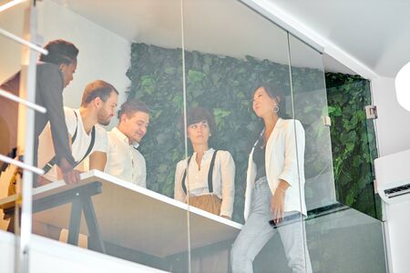 Diverse co-workers, partners stand round table talking with each other. Business partnership, discuss