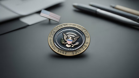 Detailed close-up image of a decorative golden shield emblem set against a dark textured surface. The shield's intricate design and the interplay of light and shadow on the textured background are emphasized.