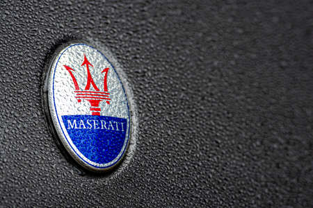 London, England, UK - December 31, 2019: the trident logo of the Maserati car company on a shiny car covered with raindrops, Maserati is a luxury car manufacturer based in Italy