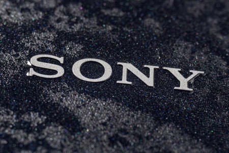 Tyumen, Russia-May 25, 2021: Sony brand name inscription on dark background. Macro selective focus