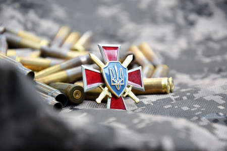 The badge of the ground forces of Ukraine against the background of military camouflage surrounded by shells. War in Ukraine. stop war.
