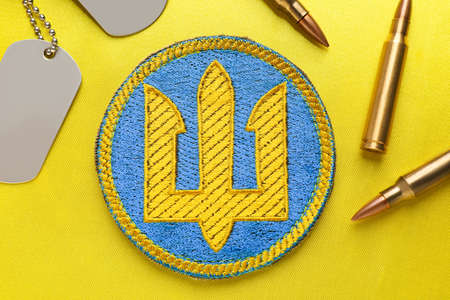 Flat lay composition with Ukrainian army chevron, military ID tags and bullets on yellow background