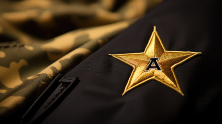 A close-up view displays a metallic star emblem resting on a piece of emerald-colored fabric. The fabric exhibits a subtle texture, with soft lighting enhancing the visual appeal. This image could be suitable for various design projects, including those related to fashion, decor, or conceptual illustrations.