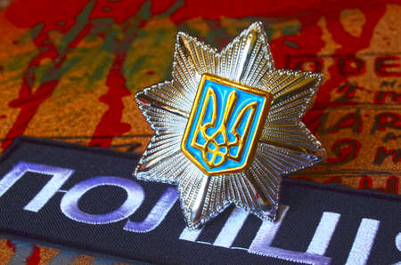 KYIV, UKRAINE - SEPTEMBER 17, 2025 Ukrainian Police badge on Ukrainian national flag surface close up