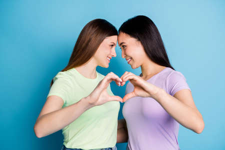 Photo of affection feelings lesbians couple young ladies romantic date make fingers heart shape symbol lean heads lovers look eyes wear casual t-shirts isolated blue color background