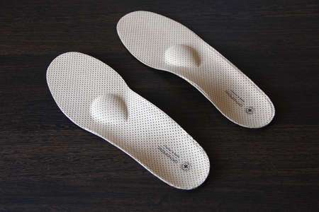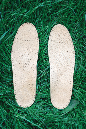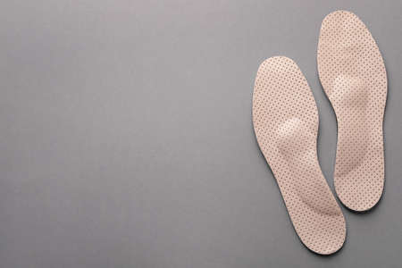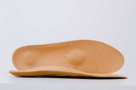 Leather orthopedic insoles on neutral background. Prevention and treatment of flat feet. footcare.