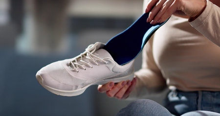 Fitness woman in sportswear with orthopedic insoles and sneakers. Woman putting orthopedic insole into shoe at home close up. Foot care banner. Flat Feet Correction.