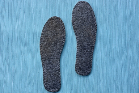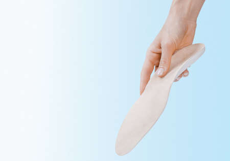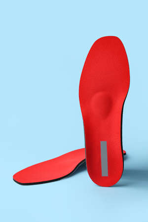 Orthopedic insole isolated on a blue background. Medical insoles. Treatment and prevention of flat feet and foot diseases. Foot care, feet comfort. Wear comfortable shoes. Flat Feet Correction.