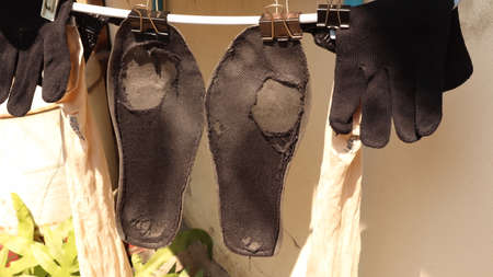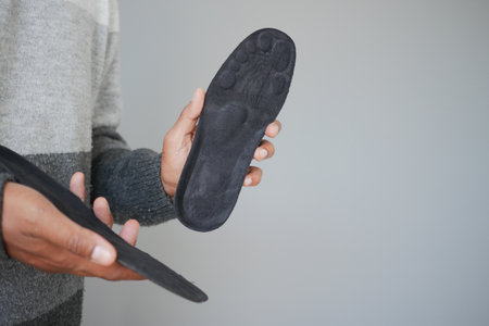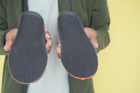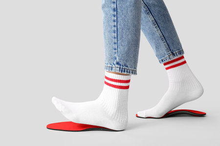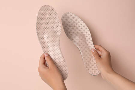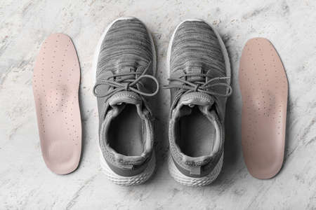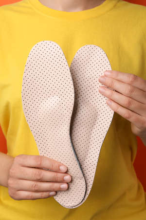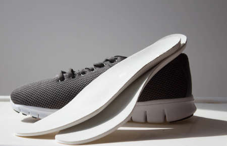 Orthopedic insoles for sports shoes. Treatment and prevention of flatfeet and orthopedic foot diseases. Foot care, feet comfort. Health care wearing comfortable shoes