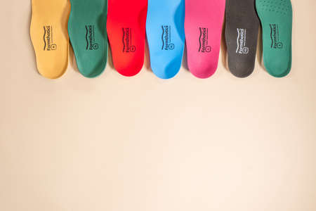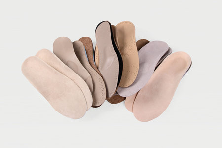 Studio photo of orthopedic insoles. A variety of orthopedic insoles are laid out in a row. Different colors and coatings: leather, cotton, microfiber.