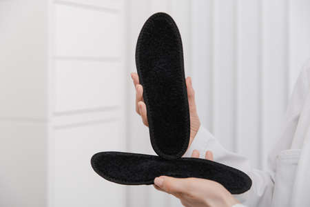 Doctor holding orthopedic insoles in his hands. Orthopedist tests the medical device. Orthopedic insoles on a white. Foot care. Flat Feet Correction. Prevention of flat feet and foot diseases.