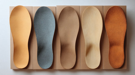 A visually appealing display of five distinct shoe insoles showcasing a variety of colors and textures, emphasizing comfort and support for diverse footwear styles.