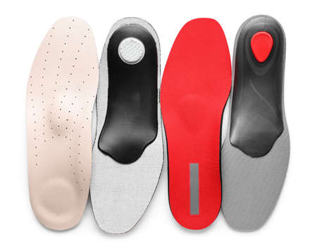 Isolated orthopedic insoles on a white background. Medical insoles. Foot care. Insole cutaway layers. Treatment and prevention of flat feet and foot diseases. Inner soles of shoes.