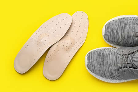 Pair of orthopedic insoles and sportive shoes on yellow background, closeup